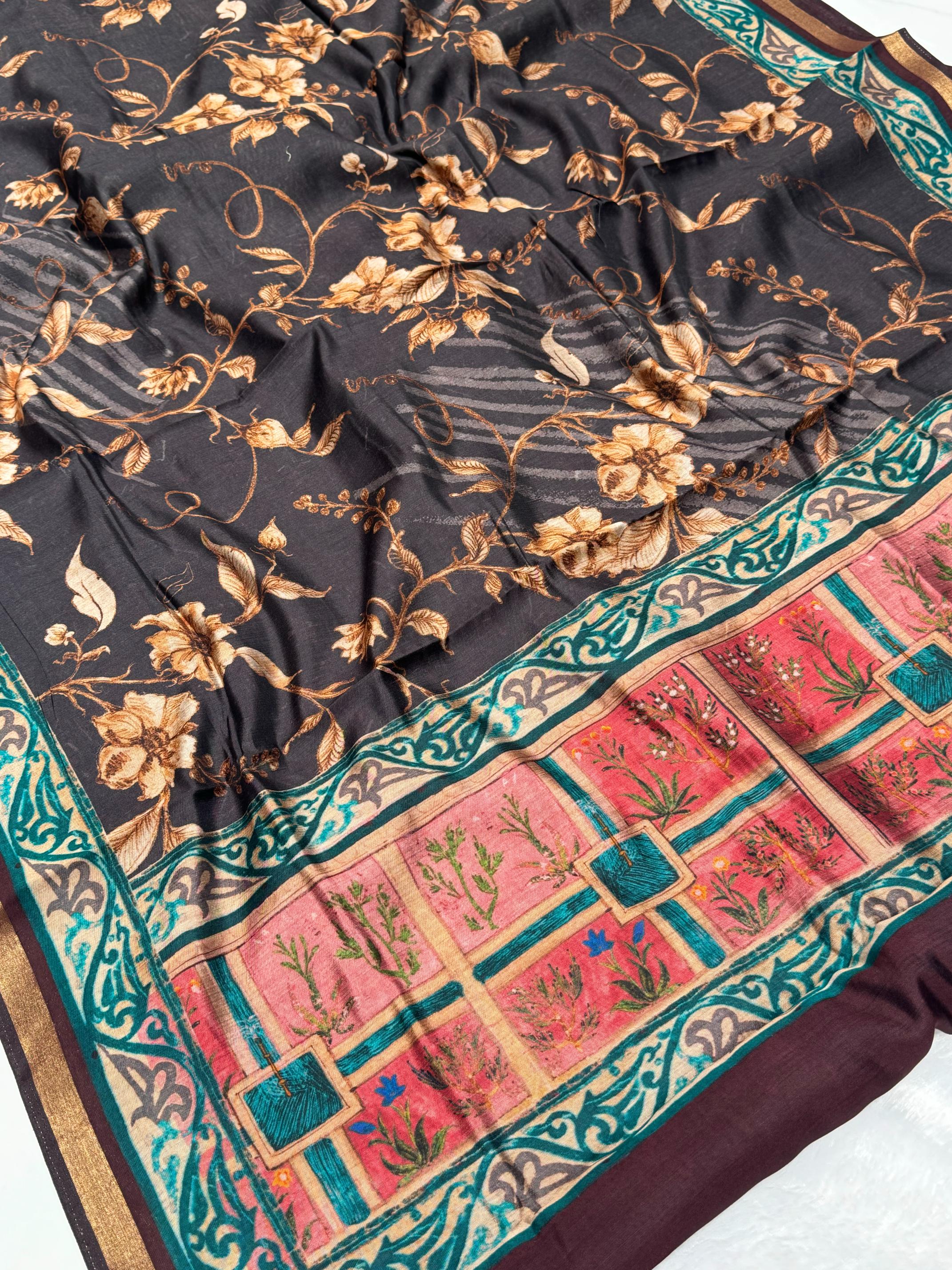 Ajrakh Printed Modal Silk P...Ajrakh With Kalamkari Design Hand Block Print Maslin silk Saree K4