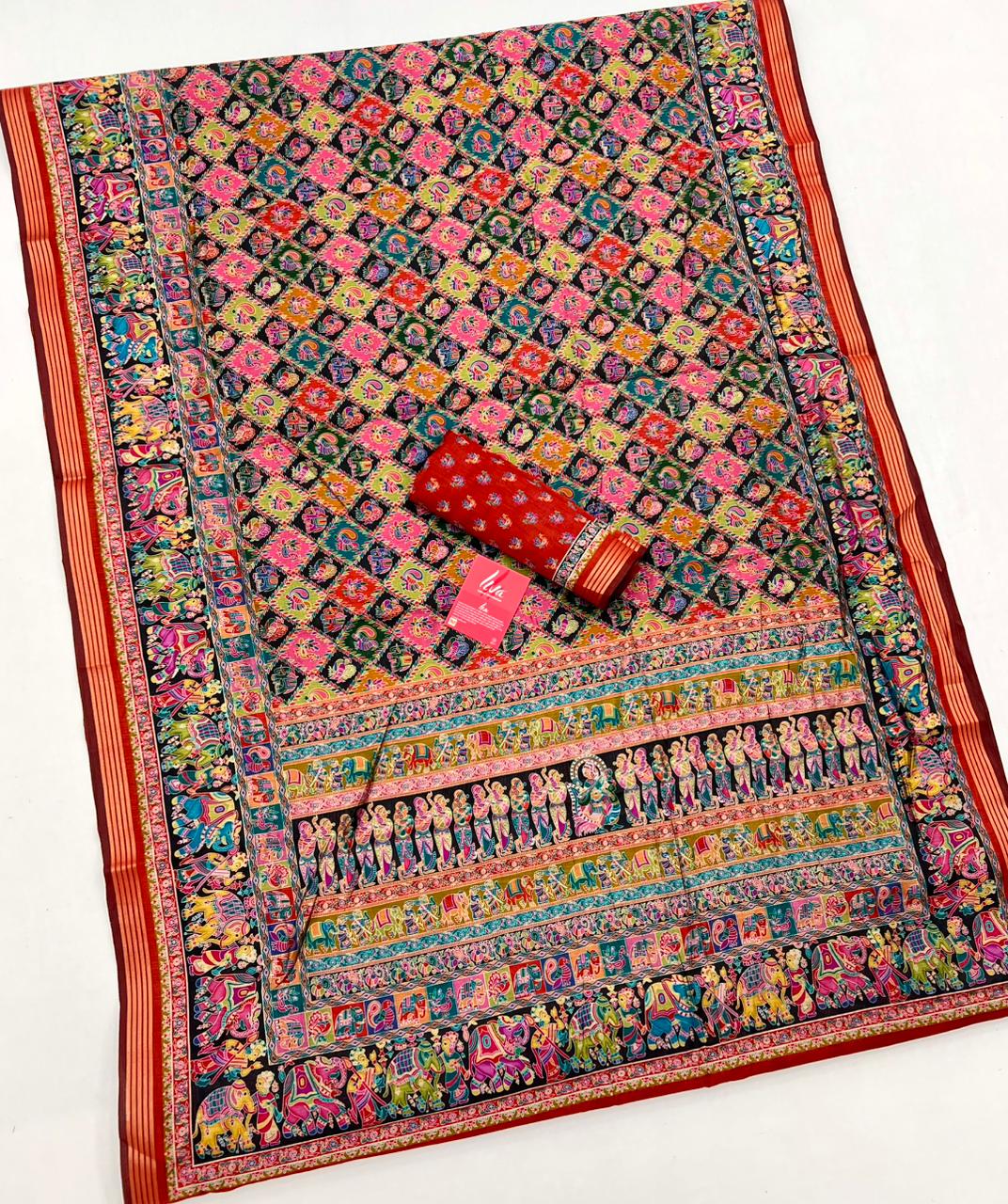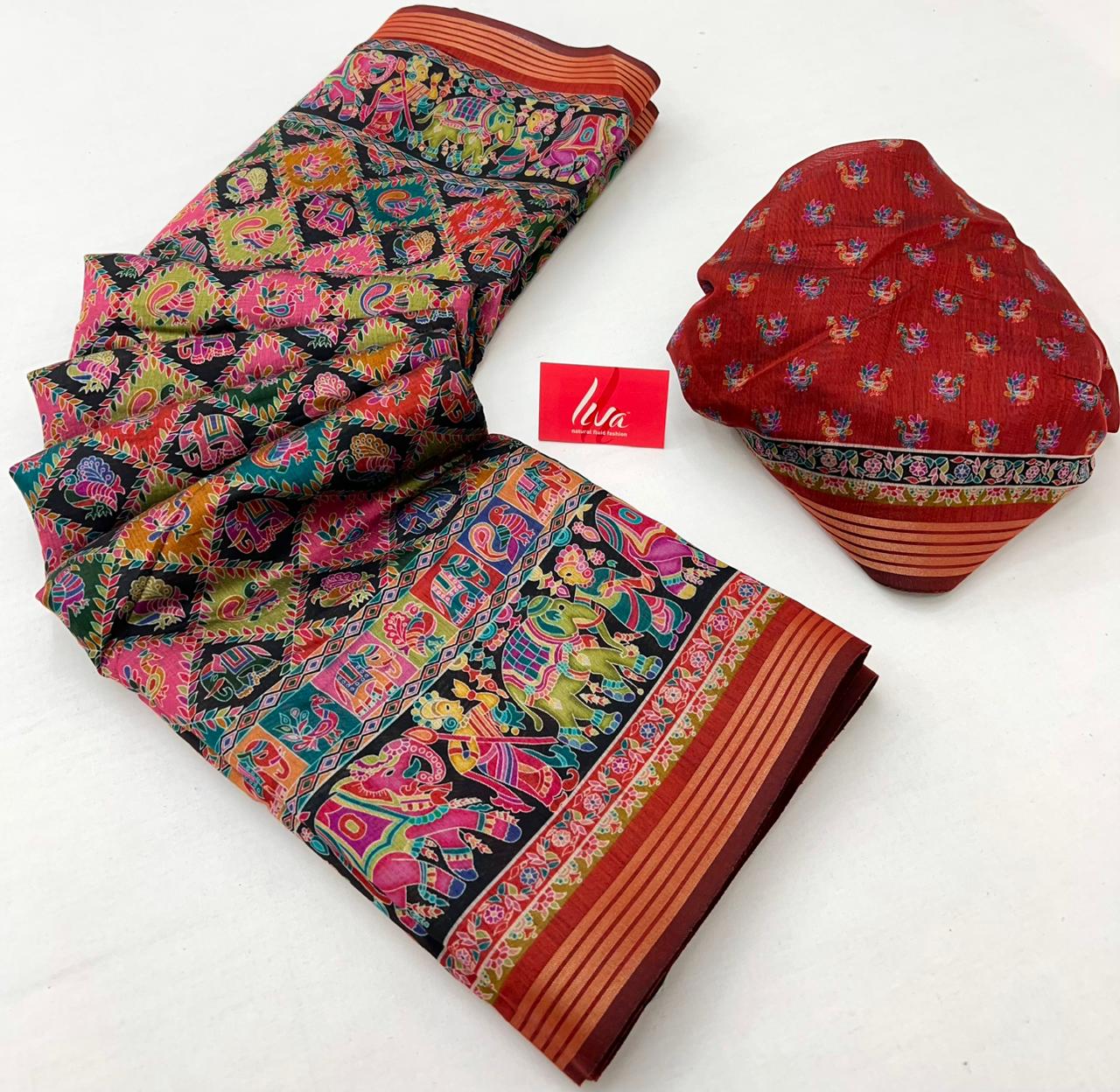 Ajrakh Kalamkari Pure Maslin Silk Saree With Evocative Blouse Piece