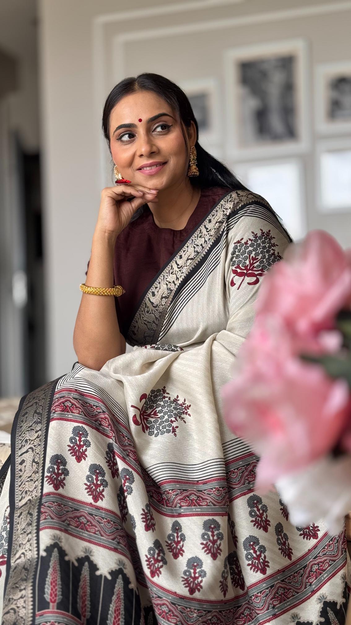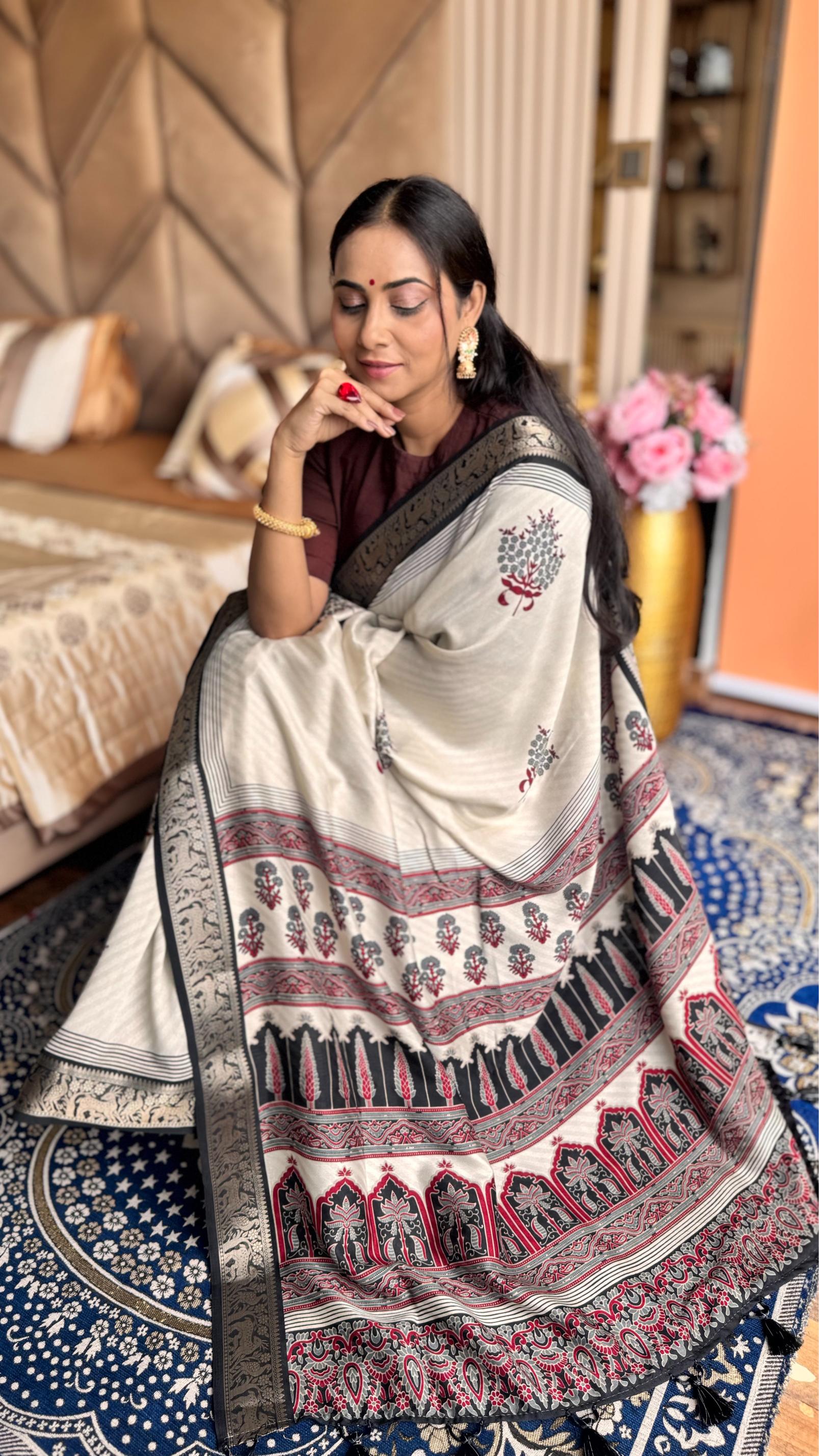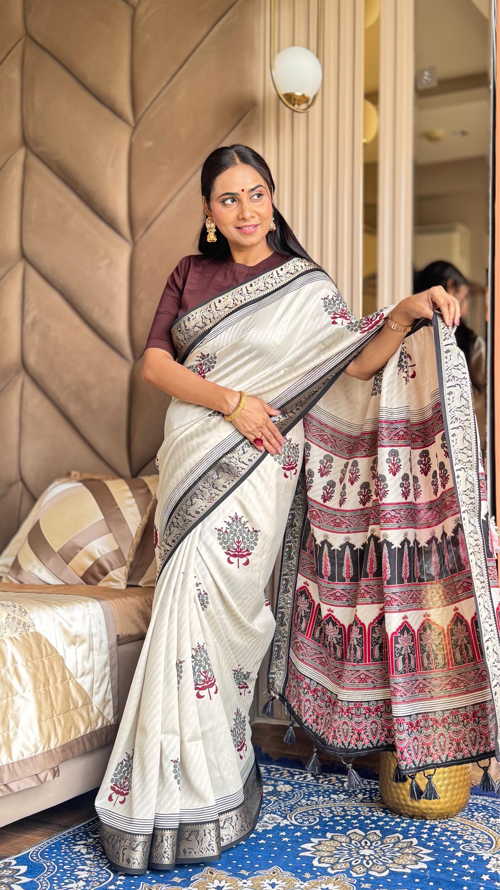Amazing Black And Cream Ajrakh Kashmiri Modal silk Buta Leriya Saree