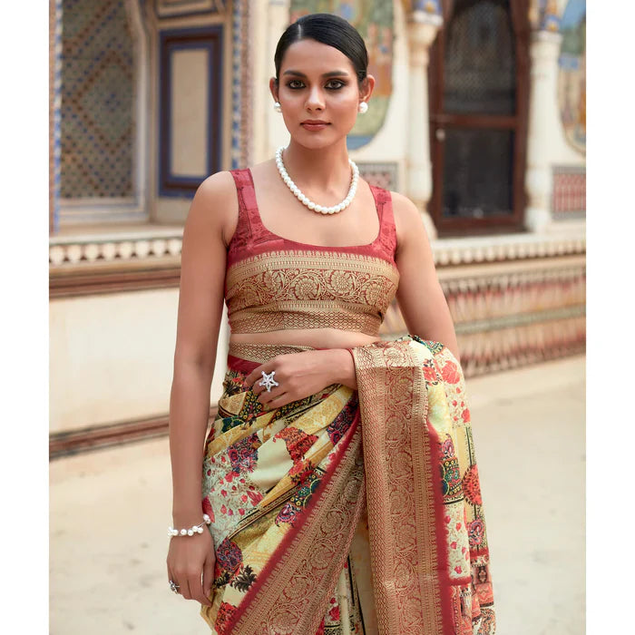 Crafted from high-quality silk and featuring an elegant Digital Print, this saree is accompanied by a matching pallu saree and blouse in the same fabric.